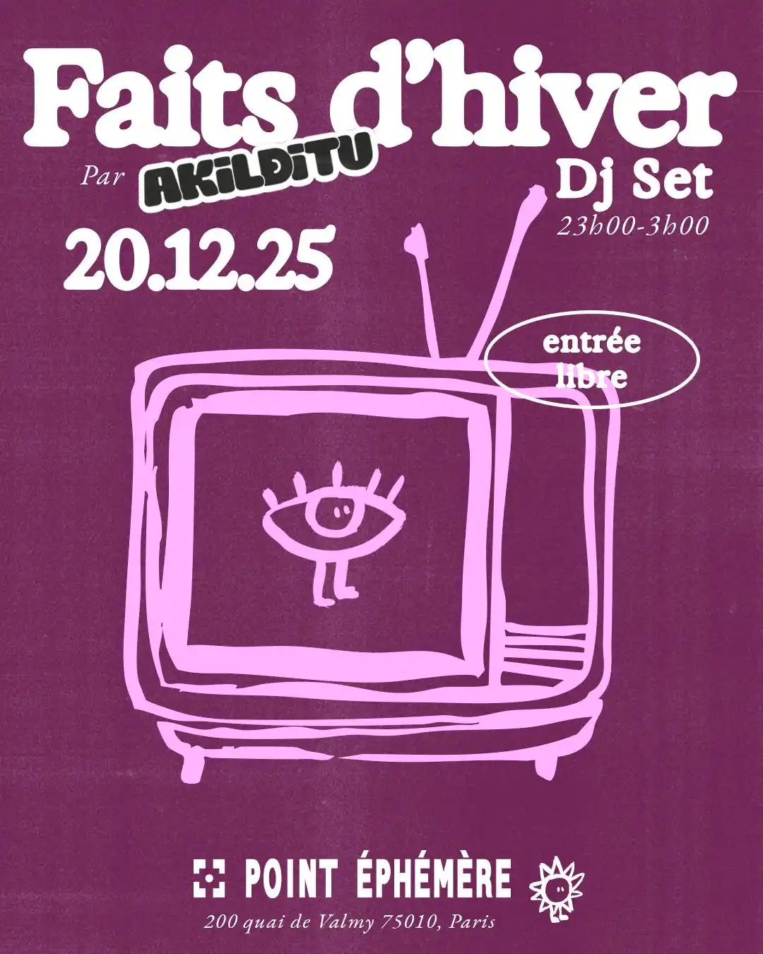 Après une troisième édition du AKiLDiTU Festival haute en couleurs : la symphonie des nuages et une rentrée riche en jolis évents, collaborations et futurs projets, on avait super hâte de tous vous convier à notre première date dans le club du Point Éphémère : Faits D’Hiver par AKiLDiTU.