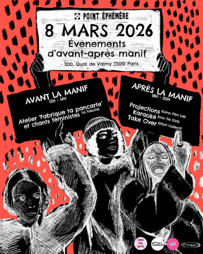 • Et après la manif, on reviendra plus déterminé·es que jamais (18h–00h) : projections de courts métrages en présence de leurs réalisatrices avec Kumo Film Lab, karaoké survolté par Emo Tie Girlz, puis take over d’Effort Collectif, quelque part entre univers bad bitches, bass music et break UK.