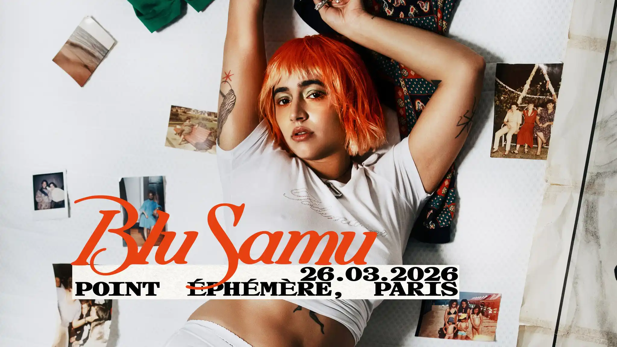 Artiste belge à la voix unique et à l'énergie indomptable, Blu Samu est de retour en 2025 avec deux nouveaux titres "I Hate Myself" et "Breakfast". Blu Samu affirme ici sa place singulière sur la scène musicale européenne : celle d'une artiste qui ose se dévoiler sans fard. Toujours sincère, toujours libre, retrouvez Blu Samu en concert le 26 mars 2026 pour découvrir son prochain album au Point Ephémère !
