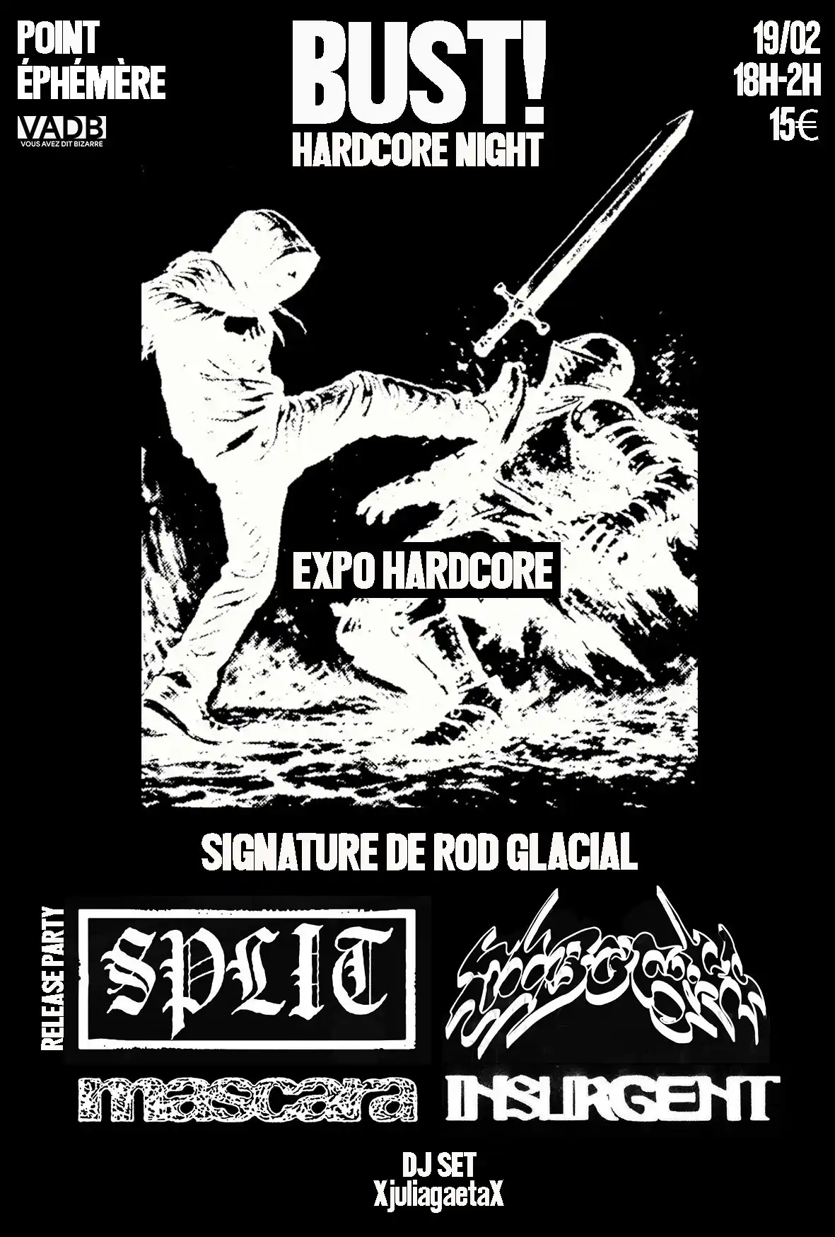 Pour continuer à célébrer la sortie (et le deuxième tirage) du livre HARDCORE - 40 ans de rage, de Black Flag à Turnstile sorti fin 2025 aux éditions Marabout, Rod Glacial vous propose un cocktail visuel mixant affiches, pochettes, photos et vidéos pour un panorama du mouvement hardcore, de 1980 à 2025. Il sera aussi possible dès 18h de se procurer l'ouvrage sur place, avec ou sans dédicace, c'est votre choix. A partir de 20h, concerts de :
