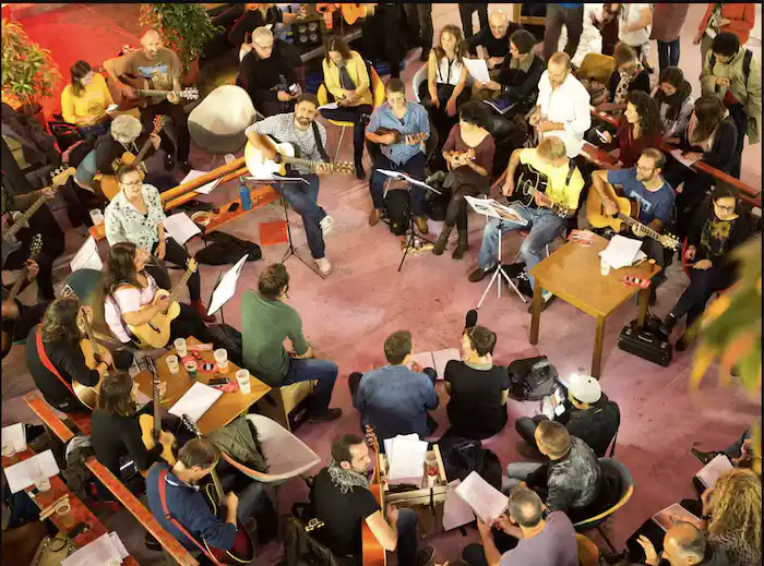 On fournit les livrets de chants avec paroles et accords, et tout le monde participe, sans scène ni pression, en acoustique et dans l'allégresse générale!