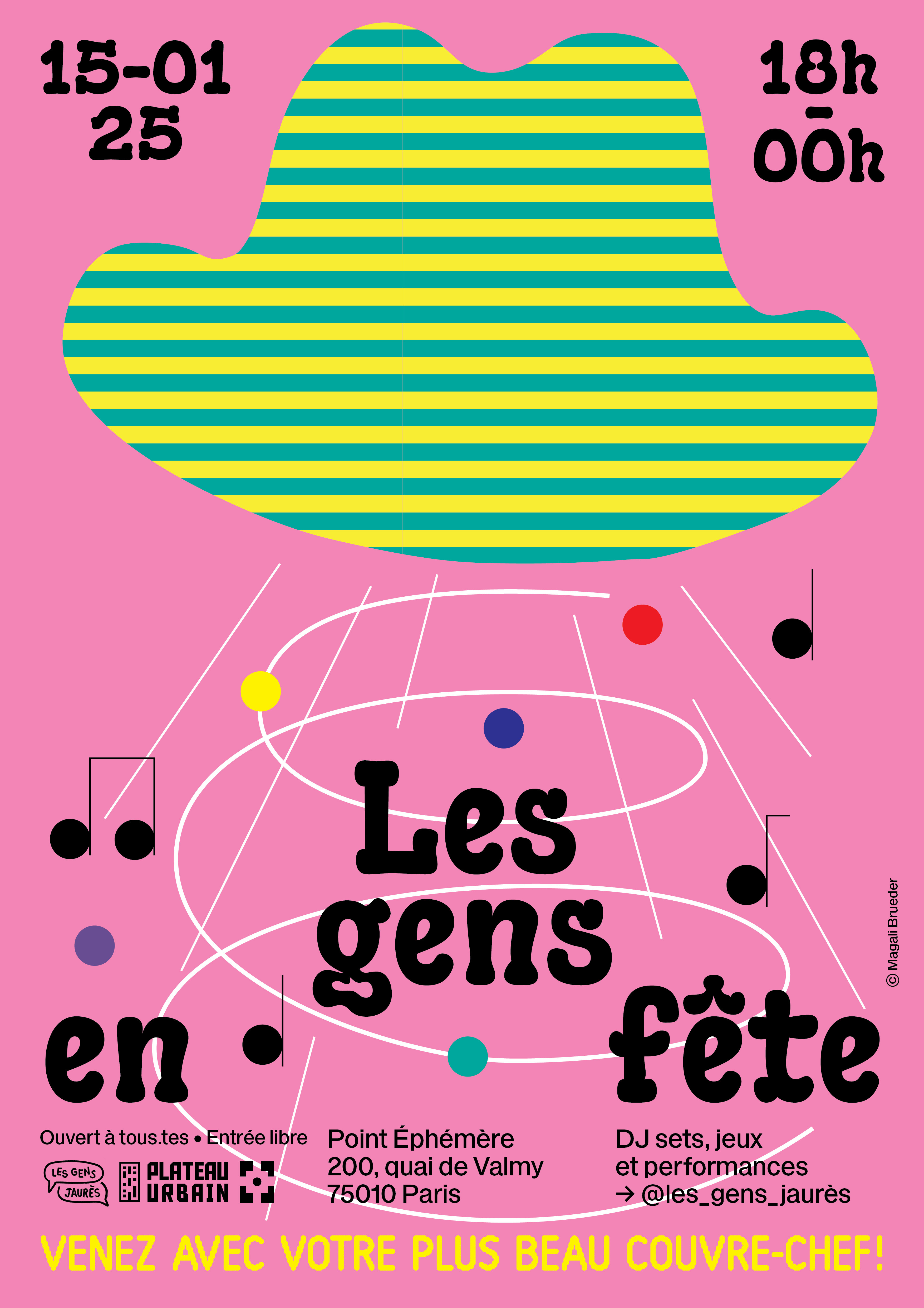 Soirée de 18h à 02h, avec ateliers, performances et DJ sets, uniquement avec des talents du lieu. Thème couvre-chef, avec une chapeauthèque pour customiser ton chapeau !