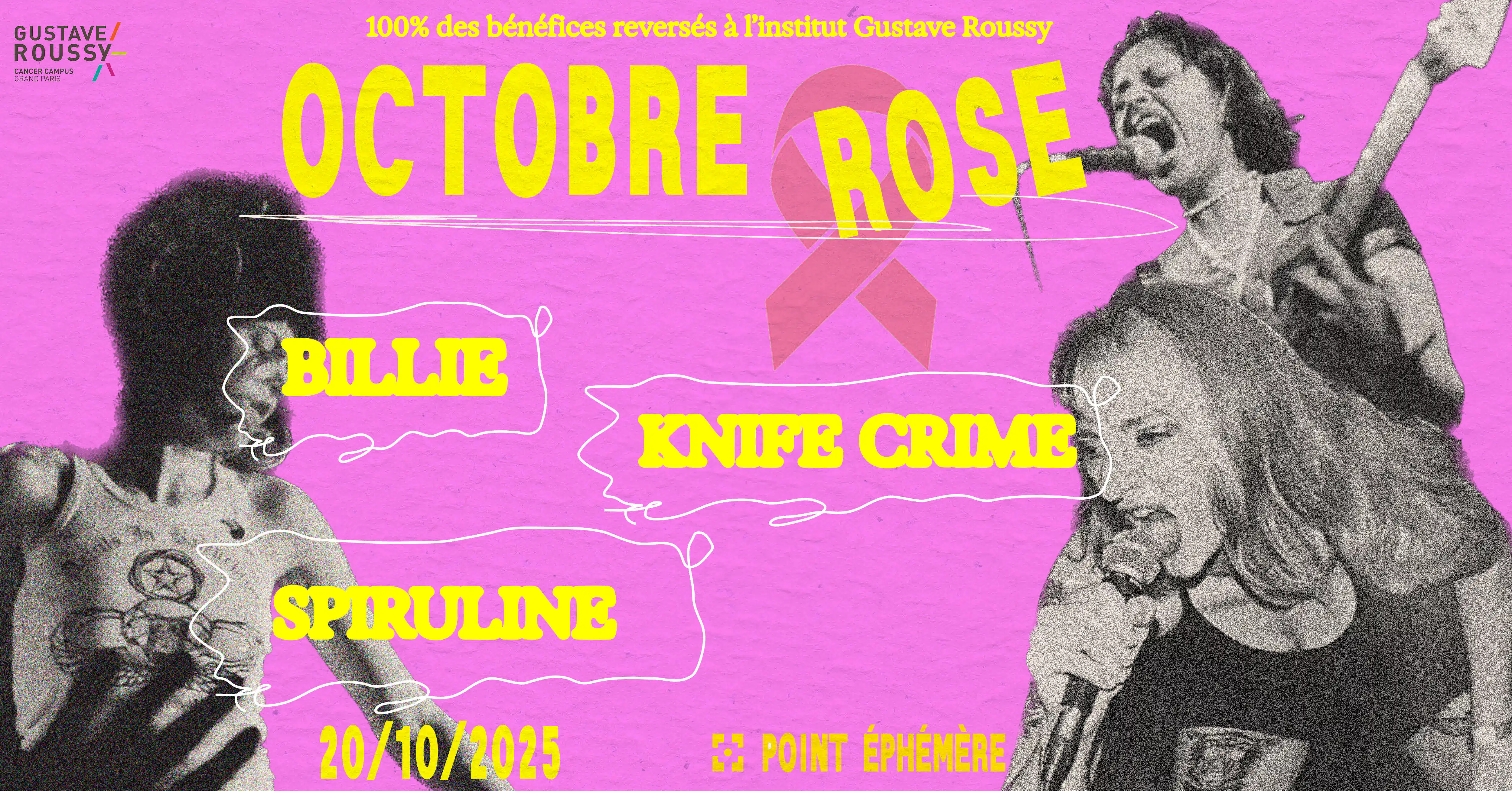 Dans le cadre du mois Octobre Rose, dédié à la lutte contre le cancer du sein, Point Éphémère se mobilise et organise un concert caritatif dont l’entièreté des recettes sera reversée à l’institut Gustave Roussy. Avec le soutien de trois supers groupes : Billie, KNIFE CRIME & SPIRULINE. Les plus longs slam de punk, toustes ensemble, contre la maladie.
