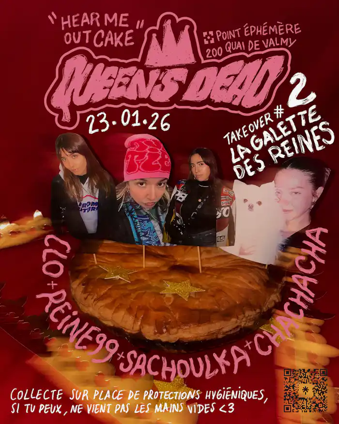 Queen’s dead revient au Point Ephémère avec leur takeover La Galette des reines #2. Leur team en trio clo, reine99 et sachoulka vous préparent un b3b mi-baddies, mi-cunt et invite la queen chachacha en précieuse guest.