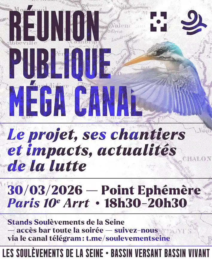 📢 Pour faire vivre la lutte et en vue des prochaines étapes de la mobilisation, venez (re)découvrir le projet, ses chantiers et impacts ainsi que les actualités de la lutte, le lundi 30 mars de 18h30 à 20h30 au Point Éphémère.