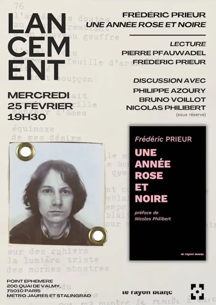 Une Année rose et noire exhume les poèmes écrits par Frédéric Prieur en 1976, à dix-huit ans. Cette année-là, Prieur rate son BTS à l'École des arts appliqués Duperré et bascule dans l'errance. Il écrit, lit Rimbaud et Artaud, écoute Pink Floyd. Les textes sont restés cinquante ans dans son atelier du Marais, enfouis sous les piles de disques, les planches de BD et les collages qui saturent son appartement. Le livre en reproduit plusieurs en fac-similés : graphie, ratures, mise en page d'origine conservées. Document brut d'une année charnière, le recueil fait entendre une voix poétique d'une intensité rare, habitée par une exigence artistique déjà pleinement assumée.